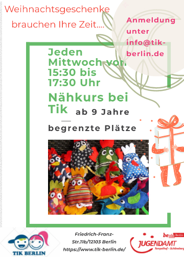 Unser neuer Nähkurs startet! Jeden Mittwoch nähen wir und lernen den ersten Umgang mit Nadel und Faden. Wir erproben uns bei kleinen Aufgaben wie Lavendelsäckchen nähen. Teilnehmerbegrenzung mit Lüften und Mindestabstand. Altersangabe: 9 bis 20 Jahre Daten/Uhrzeiten: Jeden Mittwoch im Dezember von 15:30 Uhr bis 17:30 Uhr Aufgrund auf Teilnehmerbegrenzung Anmeldung unter info@tik-berlin.de